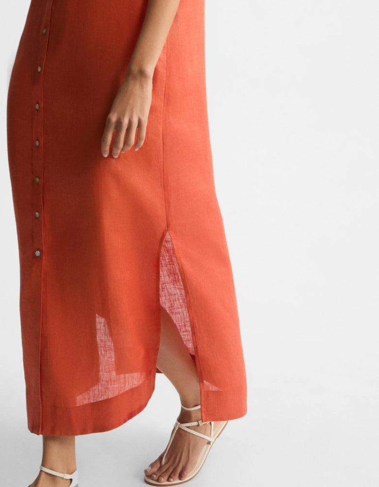 Vestido em linho 100% natural que combina conforto e sofisticação. Modelagem chemise estruturada com mangas 3/4 e comprimento longo, ideal para transições de estação. O tecido oferece toque fresco e leveza característica do linho, mantendo visual elegante e atemporal. Decote em V proporciona proporção refinada, enquanto o fechamento frontal com botões permite ajuste personalizado. Fendas laterais garantem liberdade de movimento sem comprometer a silhueta. Peça versátil que funciona tanto em ambientes casuais quanto em ocasiões mais sofisticadas, graças à sua construção impecável e material premium.