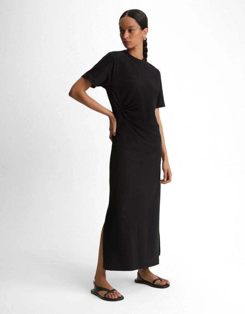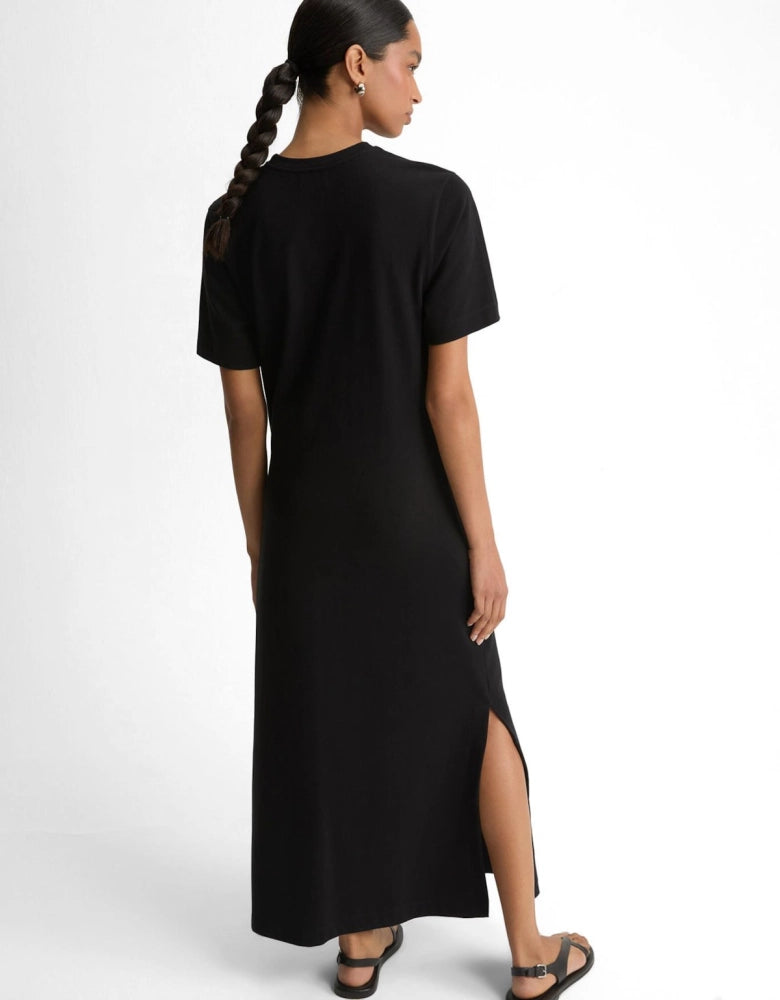 Vestido T-shirt em malha de algodão com comprimento longuete e manga curta, ideal para um visual casual sofisticado. O tecido oferece toque macio e agradável ao corpo, com algodão cultivado de forma mais responsável. Destaca-se pela moulage lateral que acompanha as curvas, criando uma silhueta elegante e fluida. As fendas laterais proporcionam liberdade de movimento e um toque moderno ao design. Decote redondo clássico completa a proposta versátil da peça, perfeita para transitar entre o dia e a noite com conforto e estilo.